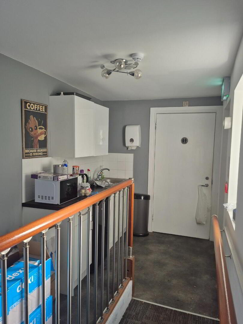 The ground floor provides an open plan area with access to kitchen and bathroom. Stairs lead to second floor which is divided into two offices/rooms.